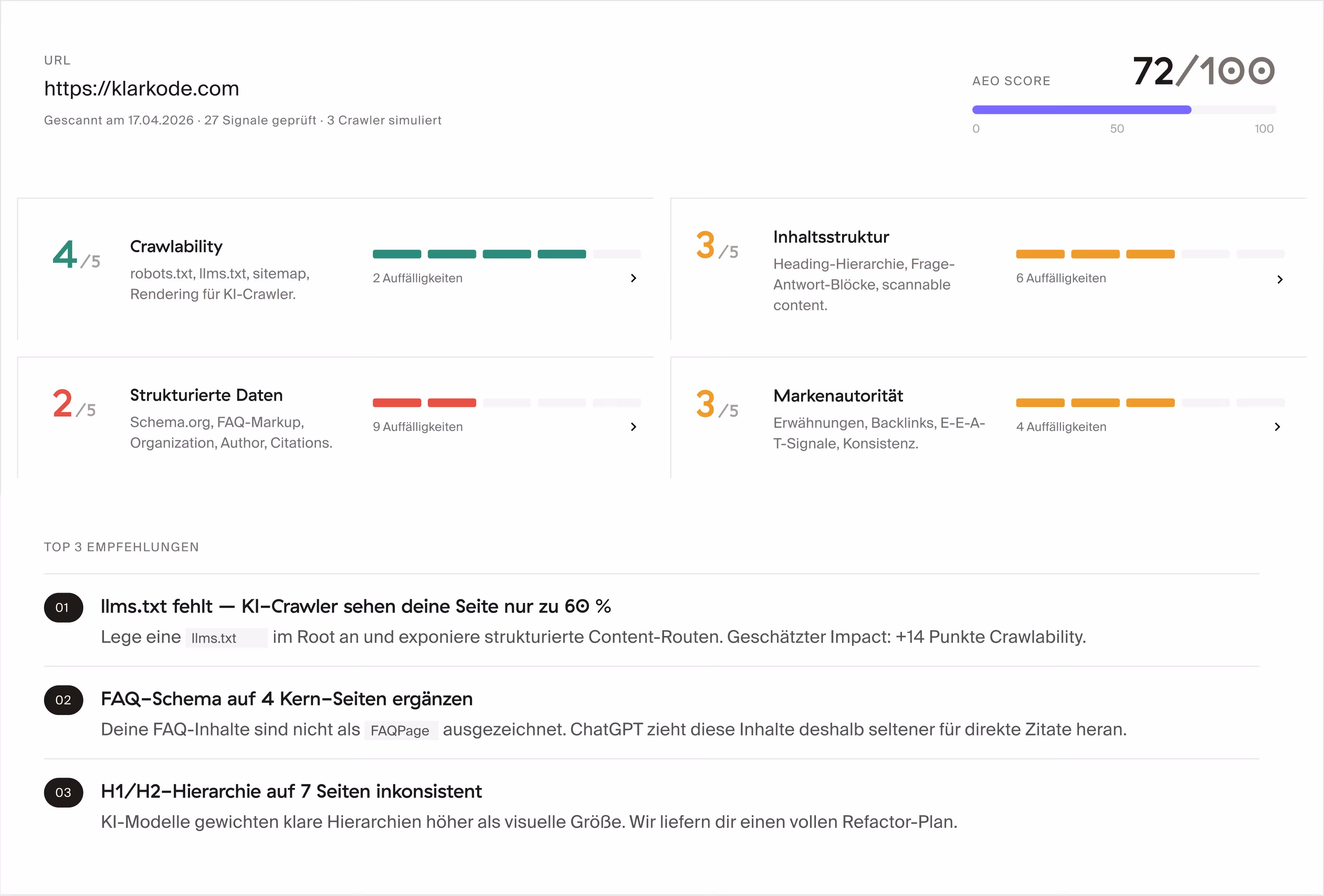 Unten ein echter Scan von klarkode.com. Wir messen dich gegen 27 AEO-Signale in vier Kategorien und zeigen dir konkret, welche Abschnitte KI-Crawler verwirren, wo Schema.org fehlt und welche deiner Inhalte von ChatGPT am häufigsten zitiert werden.